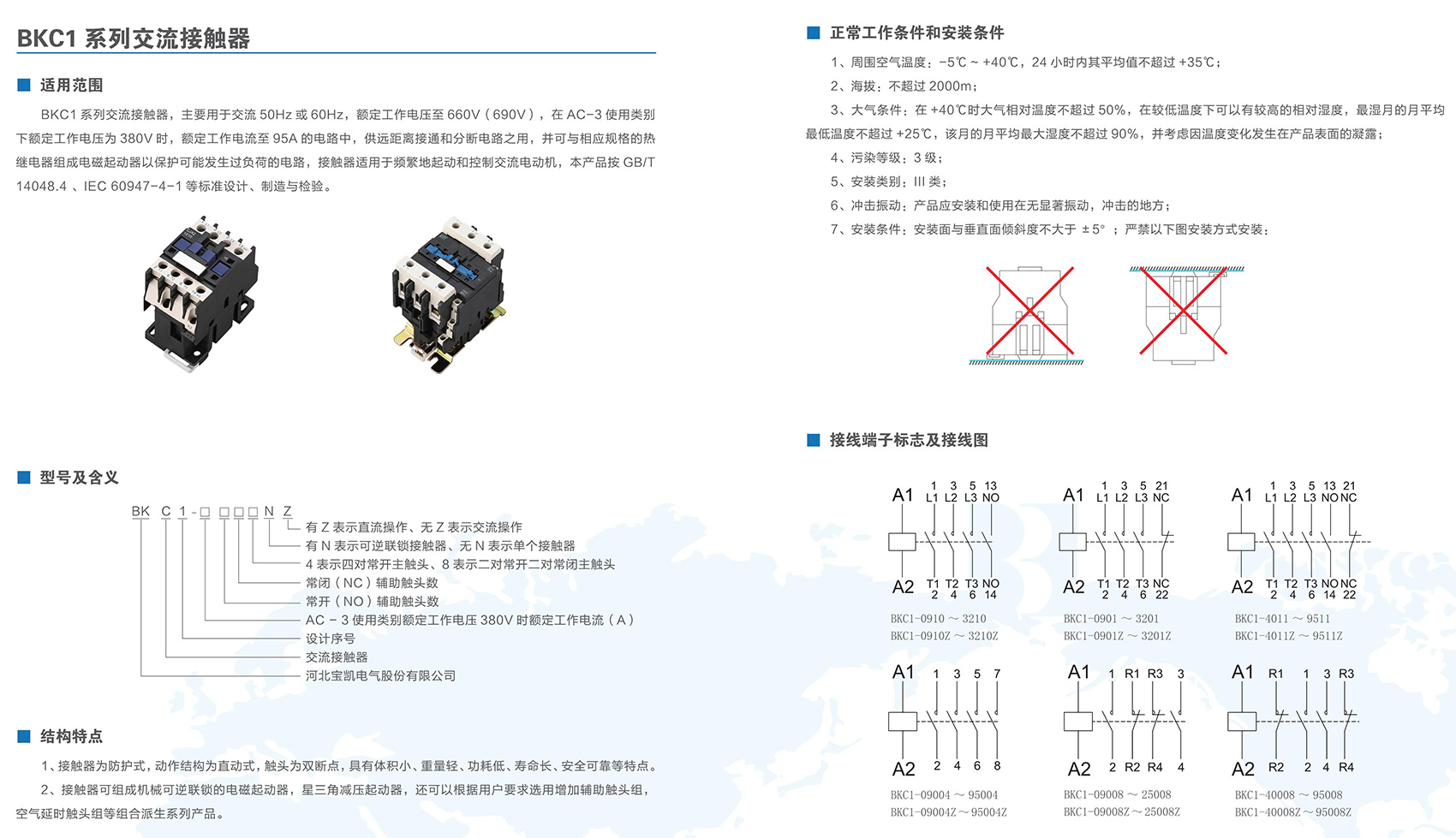 BKC1-09~95系列交流接触器,主要用于交流50Hz(或60Hz),额定绝缘电压为690V,在AC-3使用类别下额定工作电压为380V时额定工作电流为9A~95A的电路中,供远距离接通与分断电路及频繁起动、控制交流电动机;并可与适当的热过载继电器组成电磁起动器,以保护可能发生过负荷的电路。产品符合标准:IEC 60947-4,GB/T 14048.4,IEC 60947-5,GB/T 14048.5